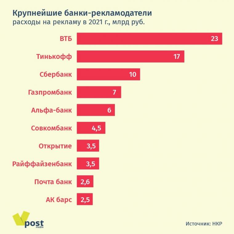 Первые три квартала крупнейшим рекламодателем среди банков был «Тинькофф», но в конце года его обогнал ВТБ, отмечает НКР. Но доля рекламных расходов у «Тинькофф» много выше: 1,86% среднегодовых активов против 0,13% у ВТБ.