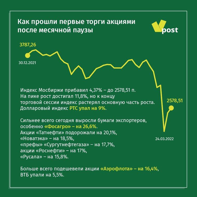 Московская биржа подвела итоги торгов акциями, первых после месячной паузы. Оборот составил 108,6 млрд рублей, в том числе в рамках аукциона открытия — 3,6 млрд руб., аукциона закрытия — 2,1 млрд.