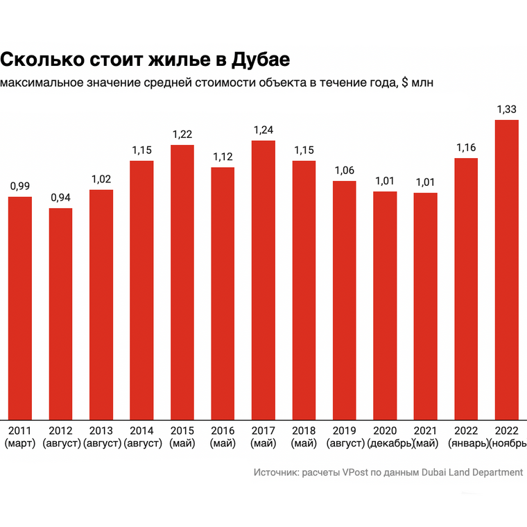 Цены на квартиры, как выяснил VPost из данных Dubai Land Department, уже по итогам ноября 2022 года тоже установили исторический рекорд, перевалив через продержавшийся пять лет пик 2017 года. По итогам ноября средняя цена объекта жилой недвижимости превысила 1,33 млн дирхамов или примерно $362 000, что на 18% выше, чем годом ранее и на 7% больше предыдущего максимума, зафиксированного в мае 2017 г. Рекорд установлен благодаря резкому подорожанию квартир — виллы в Дубае в среднем все еще стоят дешевле, чем пять лет назад.