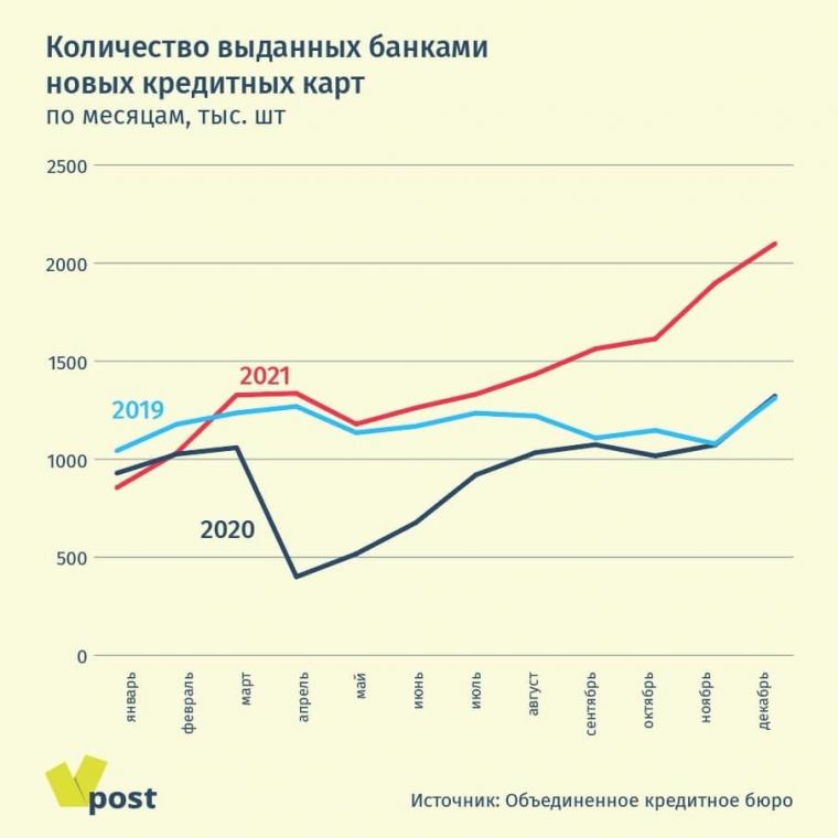 Банки побили очередной рекорд по выдачам кредитных карт. По данным Объединенного кредитного бюро (ОКБ), в декабре выдали почти 2,1 млн новых кредиток — на 11% больше, чем в ноябре и на 58% больше, чем в декабре 2020 г. Выдачи растут седьмой месяц подряд. Всего за 2021 год россияне оформили 17,1 млн кредитных карт против 11,1 млн в 2020 году, следует из статистики ОКБ.