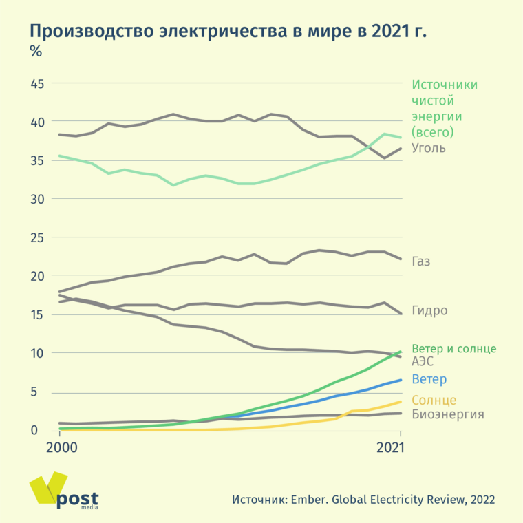 Совокупный спрос на электроэнергию благодаря восстановлению мировой экономики увеличился в 2021 г. на 5%, солнце и ветер удовлетворили 29% этого роста. Правда, и угольная генерация выросла, но чистые источники энергии в совокупности (Ember включает в них солнечную, ветряную, атомную, гидро- и биоэнергетику) ее все-таки перекрыли — 38% против 36%.