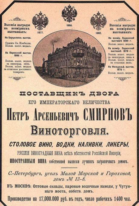 Но это было слишком хорошо, чтобы длиться долго. К концу века государственные финансы в очередной раз оказались в плачевном состоянии, и в 1894 году в России вводится новая винная монополия, которую связывают с именем министра финансов и будущего премьера Сергея Витте. Водка и все прочие спиртные напитки производились и продавались свободно, но были обложены акцизом (а импортные — еще и ввозной таможенной пошлиной). Винокуренные заводы могли принадлежать частным предпринимателям, однако производимый ими спирт принудительно выкупался по фиксированной цене казной, проходил акцизную очистку на государственных складах и продавался в государственных же винных лавках. В 1913 году общая выручка от винной монополии составила 26% доходов бюджета России. Налоги, уплаченные водочным магнатом Петром Смирновым, превосходили расходы государства на ведение Русско-японской войны.