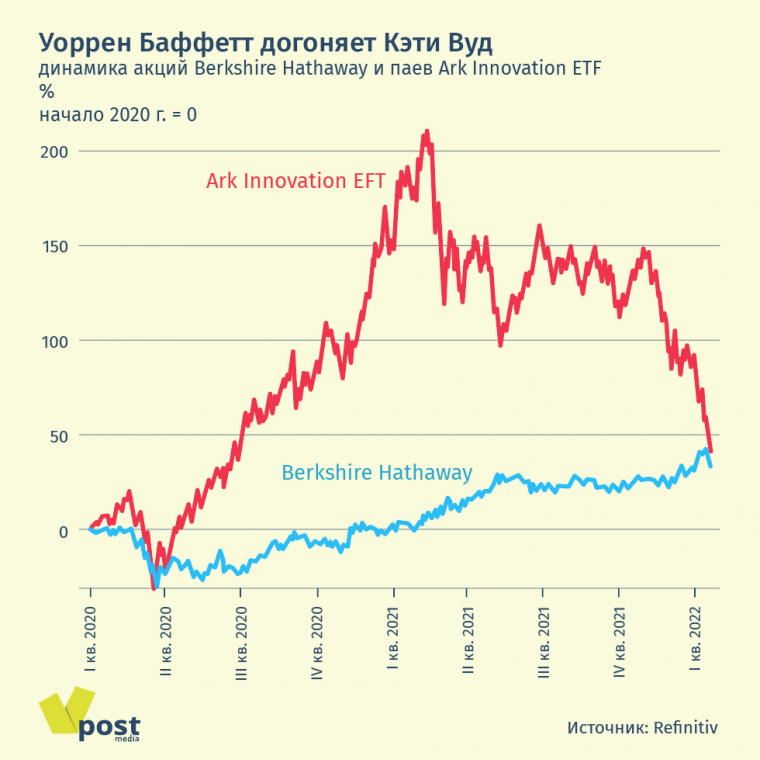 В результате с начала 2022 г. по закрытие пятницы паи Ark Innovation ETF подешевели на 24%, а акции Berkshire Hathaway выросли на 2%. А с начала 2021 г. фонд упал на 43%, тогда как капитализация компании Баффетта выросла на 34%. И теперь разница в их динамике за период пандемии (с начала 2020 г.) составляет всего 8 процентных пунктов — при гораздо меньшей волатильности у Berkshire Hathaway.