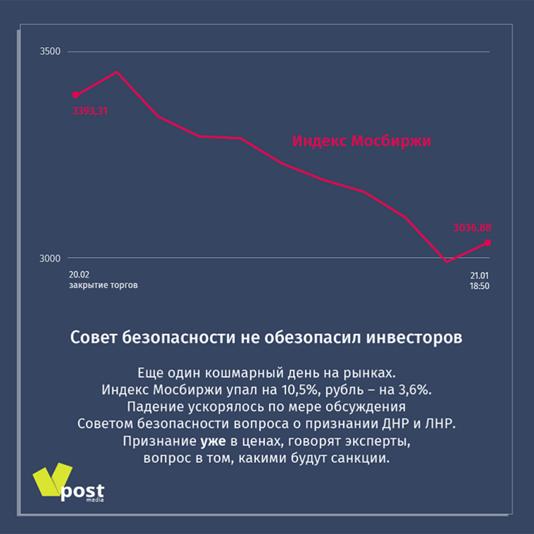 Россия стоит на пороге войны с Украиной, жестких западных санкций и необходимости сначала защищать, а потом и восстанавливать ДНР и ЛНР. Поэтому с большой вероятностью падение индекса Мосбиржи продолжится. Насколько сильно? Сие неведомо никому: может быть еще минус 10%, а может, и пополам сложимся.