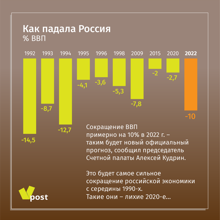 Ведущие международные экономические организации ухудшают прогнозы для России. МВФ ждет снижения ВВП России на 8,5% (в январе прогнозировал рост на 2,8%). До этого Всемирный банк предрек падение на 11,2%, а ЕБРР – на 10%. Цифры называются разные, но означают они одно – самое глубокое снижение экономики с «лихих 90-х».