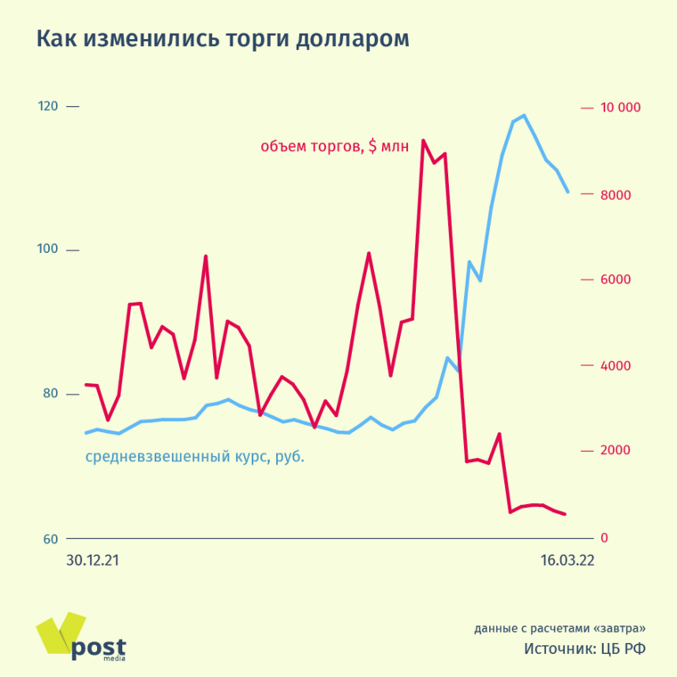 В то же время уменьшились ликвидность и обороты валютного рынка. В марте дневной объем торгов парой доллар/рубль расчетами «завтра» упал до $500-700 млн против несколько миллиардов долларов в предыдущие месяцы.