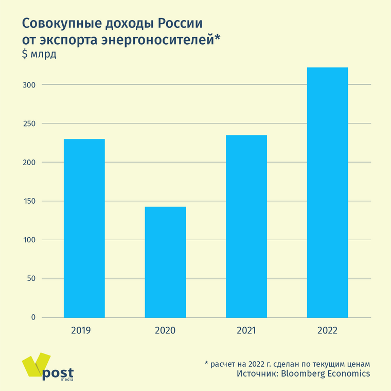 Россия ежедневно получает от Европы около €1 млрд за энергоресурсы, что заметно снижает финансовый эффект от санкций. По оценке Bloomberg Economics, при нынешних ценах совокупные доходы России от экспорта энергоресурсов составят в 2022 г. $320,7 млрд. Это примерно на 27% больше, чем в 2019 и 2021 гг. и на 55% больше, чем в 2020 г., когда цены на энергоносители рухнули из-за пандемии.