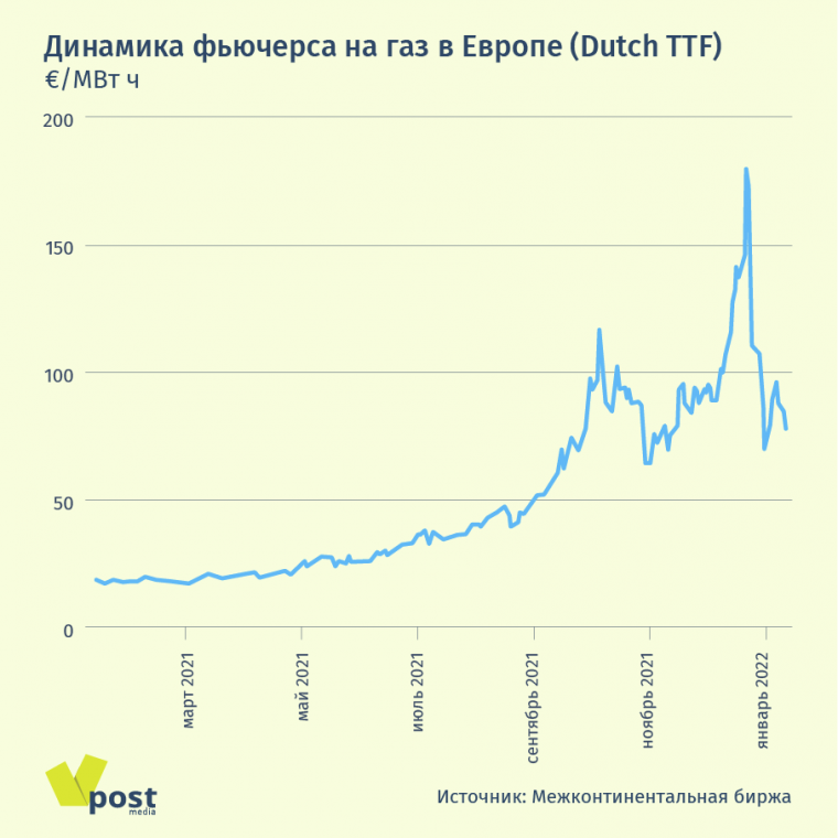 21 декабря цена газа в Европе (фьючерсы Dutch TTF) взлетела до рекордных €180,3/МВт ч ($2136 за 1000 куб. м), в 10 раз превысив цену начала 2021 г. Правда, к концу месяца она рухнула вдвое — сказались перенаправление в Европу танкеров с американским СПГ и прогнозы о мягкой погоде в январе. 6 января правительство Нидерландов также заявило, что может дать разрешение на увеличение добычи на Groningen в текущем производственном году (длится с октября 2021 по сентябрь 2022 гг.) с 3,9 млрд куб. м до 7,6 млрд куб. м, чтобы «гарантировать безопасность поставок» на европейский рынок. Окончательное решение будет принято до 1 апреля.