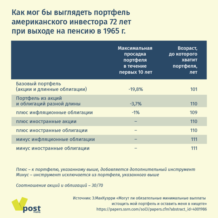Например, при выходе на пенсию в 1965 г. консервативного портфеля, включающего общий фонд облигаций, хватило бы на 38 лет против 29 при инвестициях в длинные облигации.