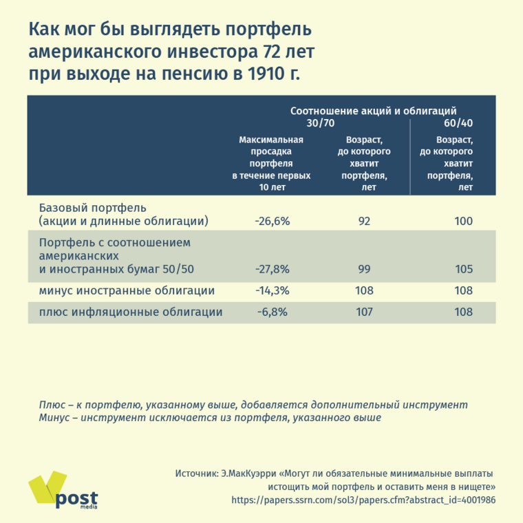 Наглядный пример — портфель американского инвестора, вышедшего на пенсию в 1910 г. Портфель, состоящий на 50% из американских бумаг и на 50% — из иностранных, прослужил бы на 5-7 лет дольше (в зависимости от пропорции между акциями и облигациями) портфеля из исключительно американских бумаг.