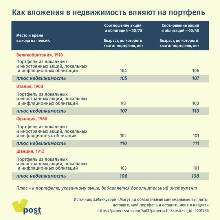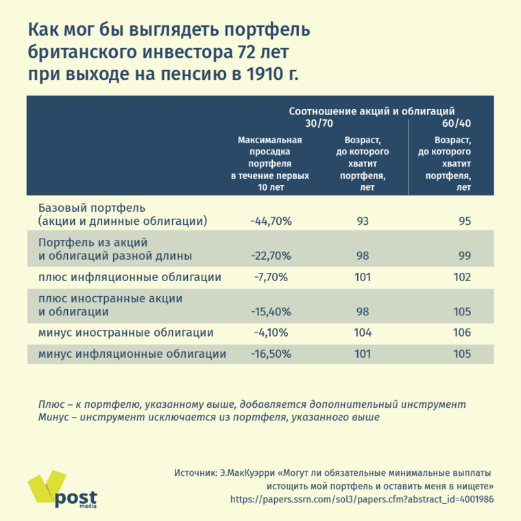 Глобальная диверсификация в большинстве рассматриваемых Маккуэрри случаях позволяла продлить срок жизни портфеля. Здесь эффективнее оказались глобальные акции, а не облигации.