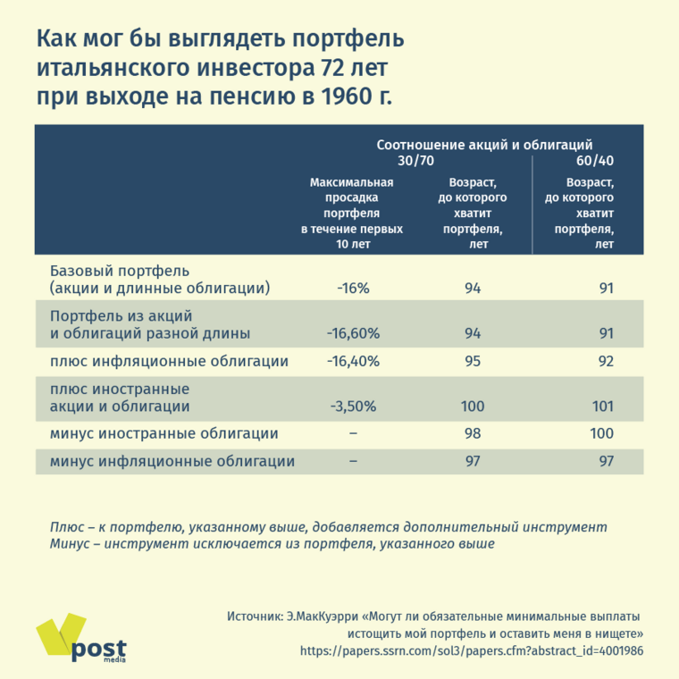 Результаты не впечатлили. Если бы итальянский пенсионер, вышедший на пенсию в 1960 г., добавил в портфель инфляционные инструменты, он продлил бы срок жизни портфеля только на год.