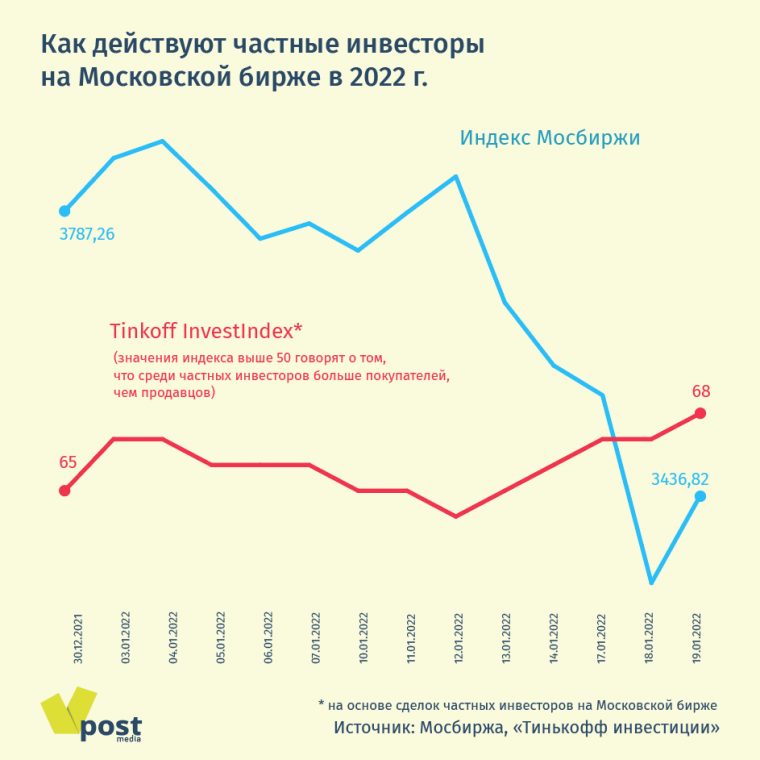 Клиенты ПСБ прошли через волну снижения фондового рынка рационально, говорит руководитель группы продаж и клиентских операций департамента управления благосостоянием ПСБ Игорь Федосенко. Он также отмечает рост активности инвесторов: их оборот в эти дни вырос примерно на 45%. Многие пользовались случаем подобрать подешевевшие бумаги. Tinkoff InvestIndex на основе сделок на Московской бирже составил 67 пунктов за 18 января и 68 п. за 19-е (значение больше 50 говорит о том, что инвесторы чаще покупали, чем продавали акции).