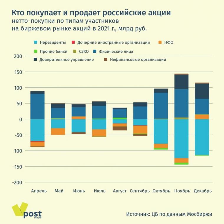 Частные инвесторы не первый раз поддерживают рынок. Например, с апреля по сентябрь 2021 г. их доля в нетто-покупках российских акций превысила 85%, отмечал Центральный банк.