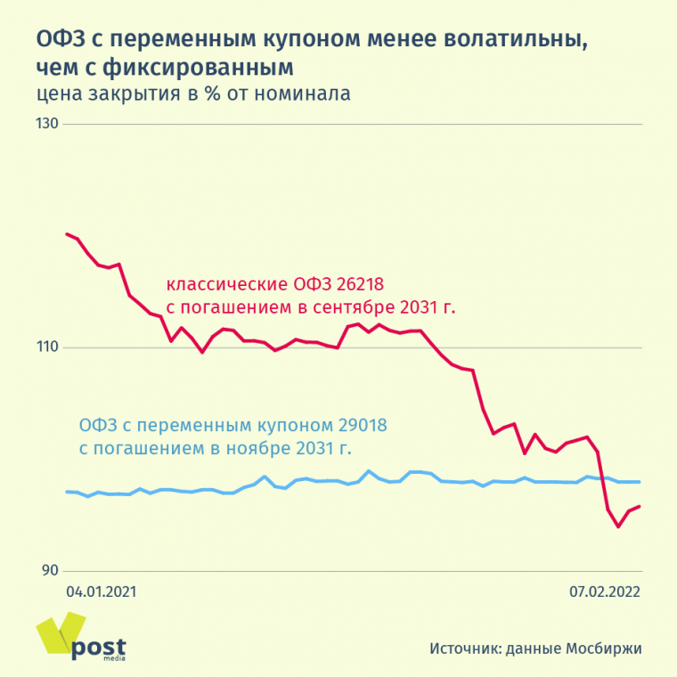 Самый распространенный их вид на российском рынке — это ОФЗ с переменным купоном (ОФЗ-пк), величина которого привязана к ставке российского межбанковского рынка RUONIA. По ней крупные банки предоставляют друг другу необеспеченные кредиты на один день, ее значение ежедневно рассчитывает и публикует Центробанк. Зачастую ЦБ реагирует на рост инфляции повышением своей ключевой ставки, а за ней меняются и ставки межбанковского рынка, получается, что ОФЗ-пк тоже реагируют на инфляцию.