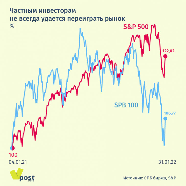 Что из этого вышло? Долгое время индекс SPB100 опережал S& P 500, но после атаки китайских регуляторов на Alibaba и другие компании, а также разговоров о предстоящем ужесточении политики ФРС из-за разгона инфляции наши инвесторы растеряли преимущество и «их» индекс проиграл американскому бенчмарку.