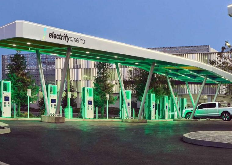 Electrify America, дочерняя компания американского подразделения Volkswagen, каждую электрозаправку делает так, чтобы ее можно было легко увидеть и опознать: они подсвечены зеленым неоновым светом и расположены в заметных местах вдоль шоссе. Одна из самых больших станций Electrify America открылась в ноябре у торгового центра Westfield Valley Fair в Санта-Кларе, шт. Калифорния: 14 пунктов быстрой зарядки расположены под навесом, покрытым солнечными панелями. Ожидая, водители могут заказать еду из ресторанов центра.