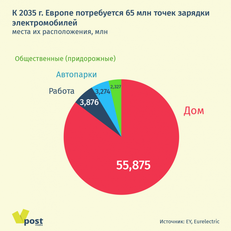 Такие расчеты основаны на другой оценке EY и Eurelectric: чтобы обеспечить новое поколение машин энергией, к 2035 г. Европе потребуется не менее 65 млн точек заправки автобусов, легковых и грузовых автомобилей, из которых более 9 млн будут в общественных местах. Сейчас EY и Eurelectric оценивают число последних в 374 000, BloombergNEF — в 445 000. На их строительство потребуется $62 млрд, а еще $72 млрд — на установку заправочных блоков в жилых домах: на них, говорится в отчете, будет приходиться около 85% всех электрозаправок.