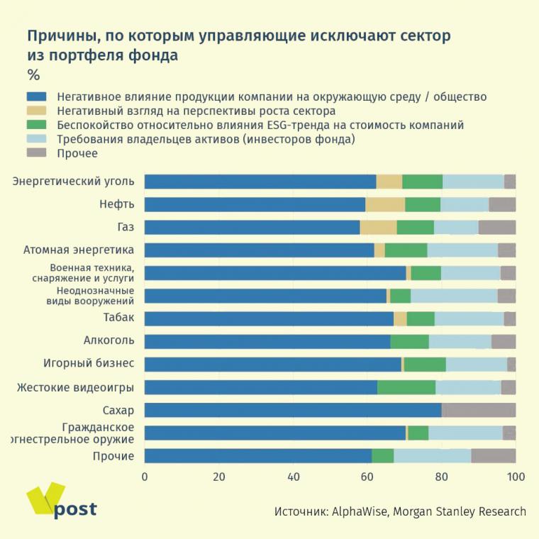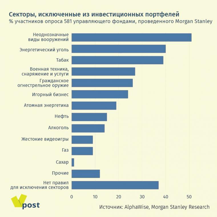 Morgan Stanley опросил 581 профессионального управляющего по всему миру о том, в компании каких секторов они отказываются вкладываться и почему. У большинства есть политика по исключению целых секторов из своих портфелей. Минимум один сектор исключен у 63% опрошенных. Из тех, у кого пока нет ограничений, 12% планируют в течение года их ввести.