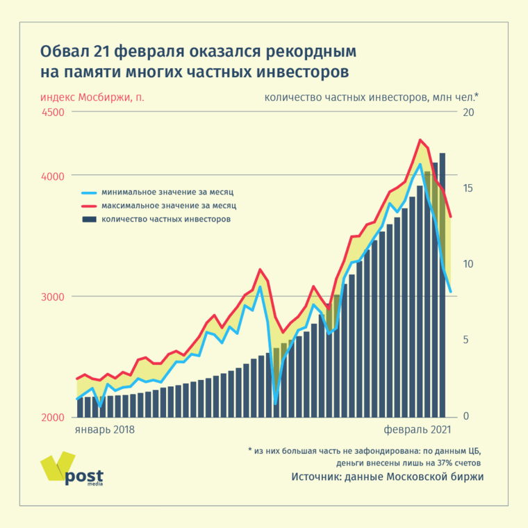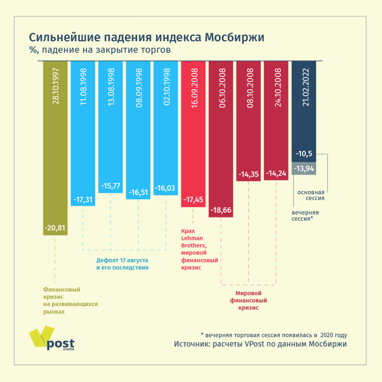 Обвал 21 февраля стал рекордным почти за 15 лет. И первым настолько сильным для многих частных инвесторов. Конечно, некоторые застали падение в начале пандемии, да и ситуация вокруг Украины давно давит на рынок, но с падением на 14–19% внутри дня большинство инвесторов, скорее всего, столкнулись впервые. На этом фоне снижения индекса Мосбиржи в ходе торгов 18 и 24 января на 7,4% и 8% выглядят разминкой перед настоящим испытанием.