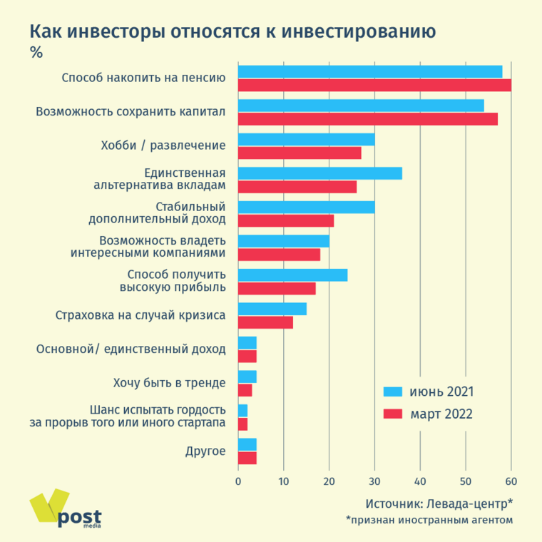 Повышение ключевой ставки до 20% привело к тому, что по сравнению с июнем прошлого года (тогда ставка ЦБ была 5,5%) гораздо меньше инвесторов стали воспринимать инвестиции как альтернативу вкладам, источник стабильного дополнительного дохода, способ получить высокую прибыль. Это объясняется ростом ставок по вкладам вслед за ключевой, а также серьезным падением российских бумаг за прошедший месяц, указывают авторы исследования.