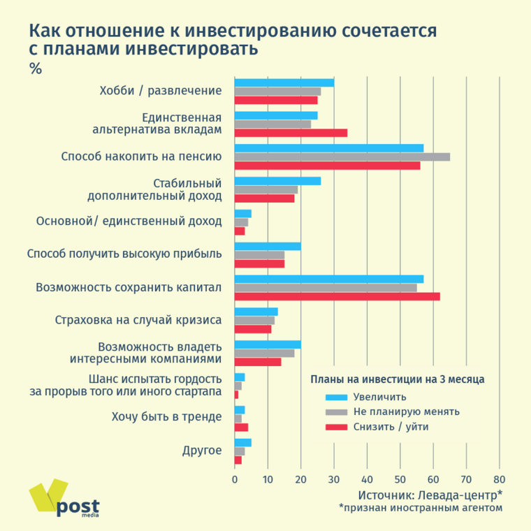 Те, кто чаще других воспринимал инвестиции как альтернативу вкладам, теперь планируют уйти с рынка или сократить размер инвестиций. А вот среди тех, кто планирует увеличить инвестиции, выше доля тех, кто воспринимает инвестиции как развлечение или надеется получать с их помощью стабильный доход. Но и для тех, и других главными ролями инвестиций остаются сохранение капитала и накопление на пенсию.