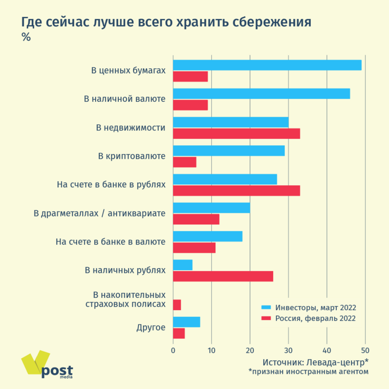 В то же время подход инвесторов к хранению сбережений сильно отличается от подхода россиян в целом (исследователи Levada сравнивали опрос среди инвесторов в марте с результатами общероссийского опроса в феврале, так что здесь нужно учитывать, что последний затронул лишь начало турбулентности). Для каждого второго инвестора лучший способ хранить сбережения — это ценные бумаги или наличная валюта, почти треть также назвали недвижимость. А вот население в целом в основном предпочитает недвижимость и банковские рублевые счета, а также наличные рубли. Инвесторы также заметно чаще россиян в целом отдают предпочтение криптовалютам.