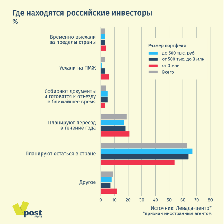 Рост интереса инвесторов к валюте можно объяснить высокой мобильностью этой группы населения, отмечают исследователи Levada lab: почти 30% опрошенных инвесторов уже покинули страну, либо так или иначе планируют отъезд. Несколько чаще об отъезде заявляли респонденты с большими инвестиционными портфелями. Зато почти две трети опрошенных не собираются покидать страну.