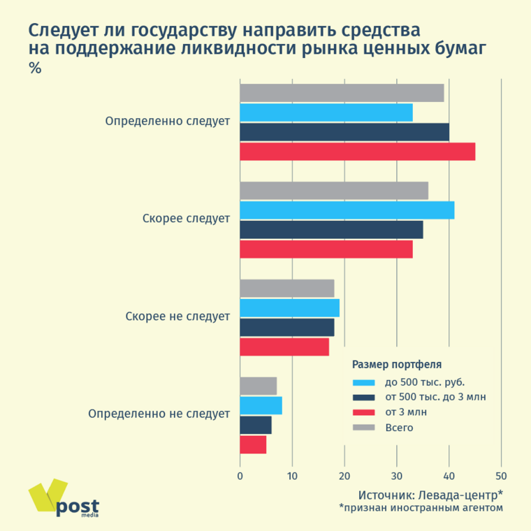 Три четверти инвесторов выступают за то, чтобы государство поддержало ликвидности рынка. Особенно категоричны в этом вопросе крупные инвесторы.