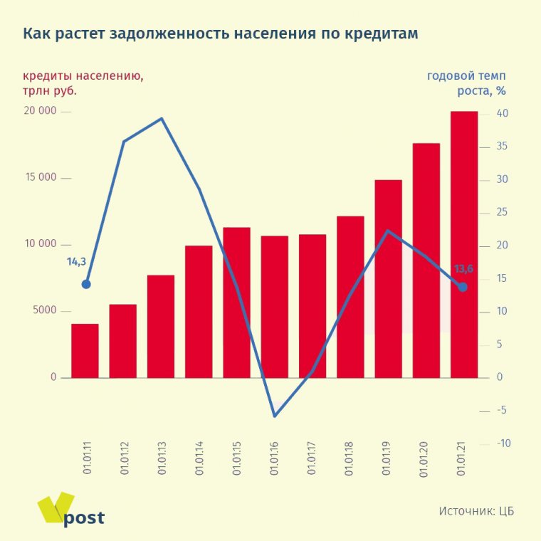 Запас для роста долга еще есть, уверена экономист «Ренессанс капитала» по России и СНГ Софья Донец: в следующие 10 лет портфель розничных кредитов может вырасти втрое, прежде всего за счет ипотеки. «Риски кроются не столько в уровне закредитованности, сколько в темпах роста кредитов, но после кризиса 2008 г., кредитного бума 2013 г. ЦБ пристально следит за кредитованием и действует на опережение», — говорит она. Росбанк также ждет замедления потребительского кредитования: по итогам года рынок вырастет примерно на 25%, а в 2022 г. — уже на 10%.