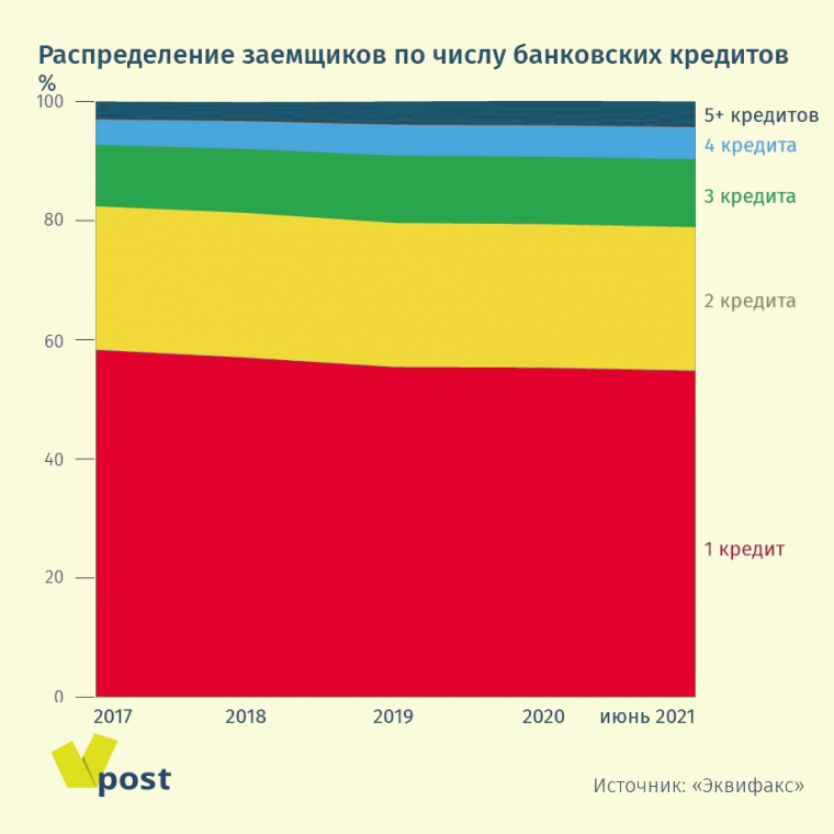 Большое число кредитов не обязательно говорит о проблемах (например, ипотека и две кредитки — и перед нами заемщик с тремя кредитами), но все же с ростом количества займов растет вероятность, что человек обременен долгами. И доля таких людей тоже растет.