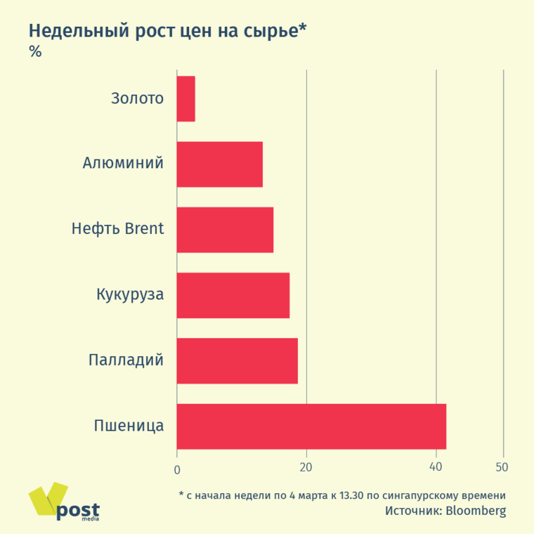 То, что российские власти называют «специальной операцией» на Украине, привело к стремительному росту цен на многие сырьевые товары — нефть, газ, металлы, включая алюминий и никель, сельскохозяйственную продукцию, прежде всего пшеницу. Индекс сырьевых товаров S&P GSCI подскочил на 16% на этой неделе, в результате недельный рост может оказаться самым значительным с 1970 г., с которого Refinitiv собирает данные.