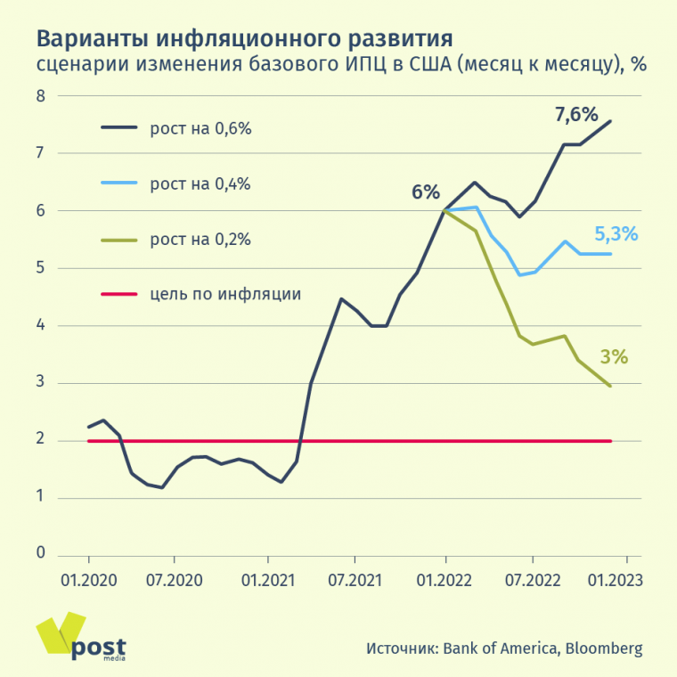 В январе она была 6%, при этом рост по отношению к декабрю составил очень высокие 0,6%. Если такие темпы месячного роста сохранятся, то в конце года базовая (а даже не совокупная!) инфляция будет 7-8%, посчитали аналитики BofA. Если они замедлятся до 0,4% — то 5-6%, а чтобы получилось 3% (и это все равно выше цели в 2%), цены должны расти не более чем на 0,2% месяц к месяцу.