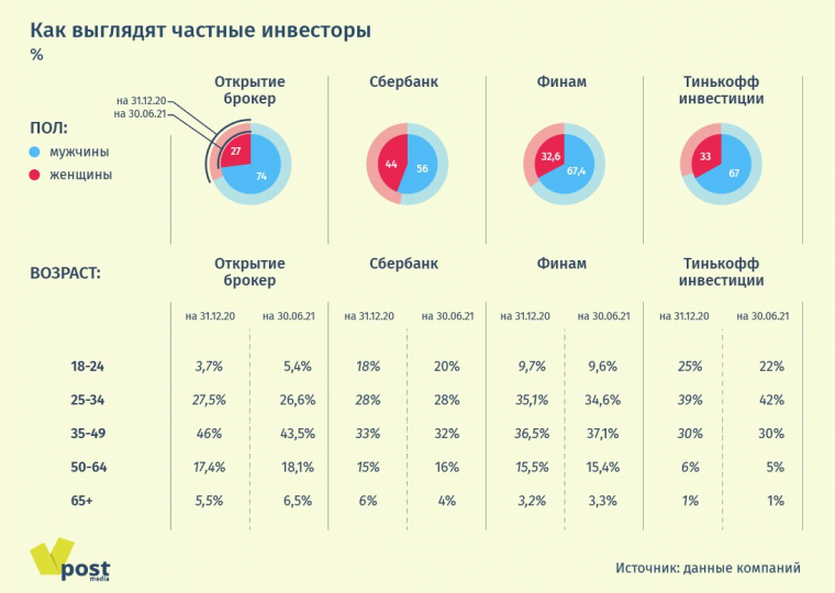 На них приходится от 53 до 70% клиентов брокеров. Хотя количество женщин постепенно растет: например, в «Тинькофф» в конце 2018 г. инвестировали чуть меньше 22% женщин, а к июлю этого года — уже 31%.