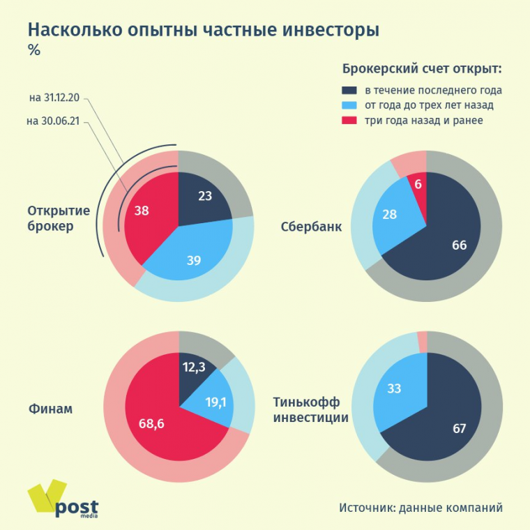 Две трети клиентов «Тинькофф инвестиций» и Сбербанка — крупнейших брокеров по числу счетов — открыли счет в течение последнего года. А вот большая часть клиентов «Финама» и «Открытие брокера», которые работают на рынке частных инвестиций дольше, открыли счета три года назад и более.