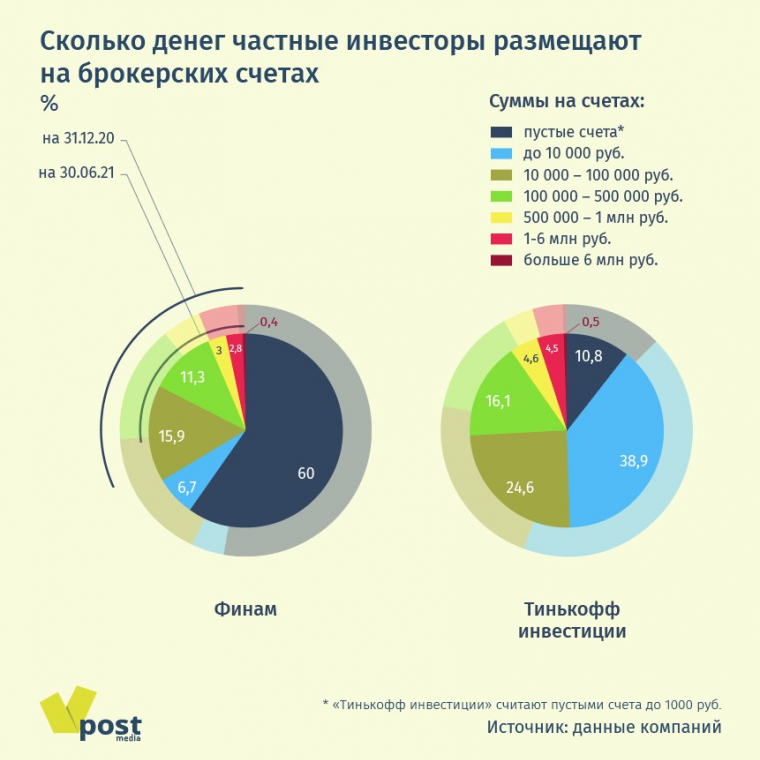 В «Финаме» пустует 60% брокерских счетов, в «Тинькофф» пустых счетов — 11%, но еще на почти 40% лежит менее 10 000 руб. (другие брокеры структуру счетов не раскрыли). Это совпадает с цифрами ЦБ: по его подсчетам, на конец сентября пустовали 63% брокерских счетов, еще на 19% лежало до 10 000 руб.