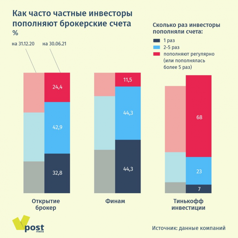 В нем приняли участие «Тинькофф инвестиции» (7,6 млн клиентов на конец октября), Сбербанк (5,3 млн), «Открытие брокер» (более 394 000) и «Финам» (более 310 000). Мы также использовали некоторые данные из нашего прошлогоднего опроса, хотя выборка брокеров там была немного иная. Кроме того, для полной картины мы также обращались к исследованиям Центрального банка и «Левада-центра» (внесен Минюстом в реестр НКО, выполняющих функции иностранного агента).