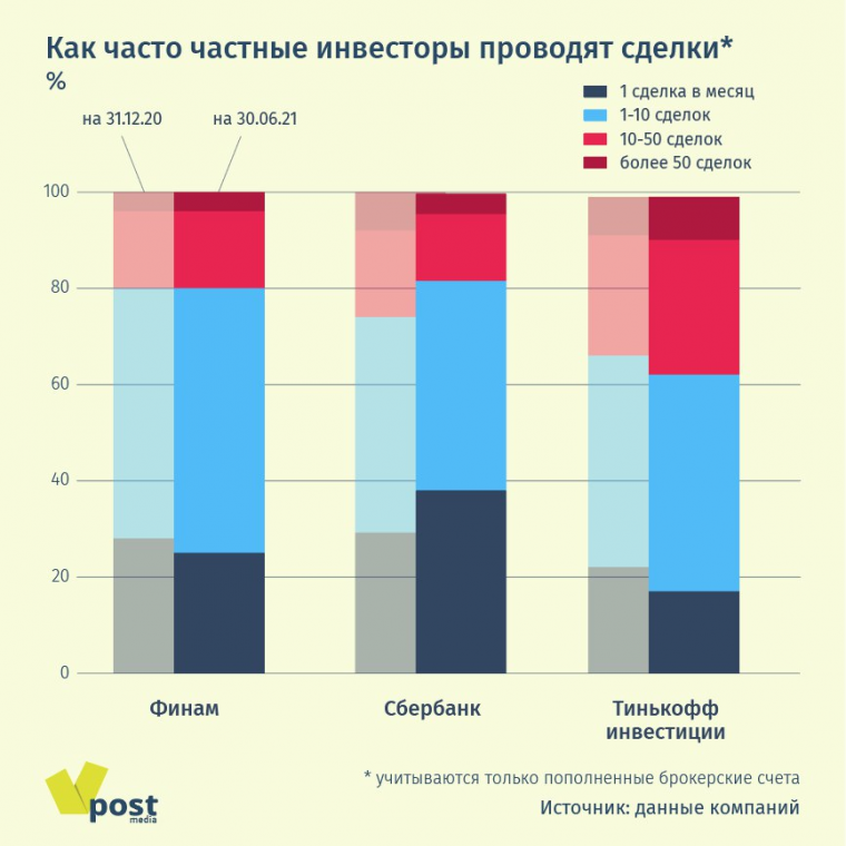 И только примерно через полгода, по словам Швецова, брокерский счет начинает пополняться деньгами — если человек почувствовал аппетит, постепенно он становится более активным. Отчасти это видно и по данным, которые прислали брокеры: за первую половину 2021 г. вес пустых счетов и счетов до 10 000 руб. в «Тинькофф» и «Финаме» снизился (хотя все еще остается наибольшим), зато доли счетов с бОльшими вложенными суммами росли. При этом каждый второй владелец непустого счета проводит от 1 до 10 сделок в месяц.