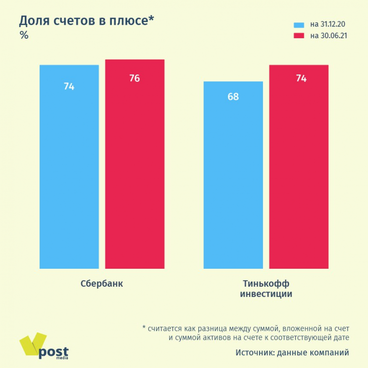 Три четверти счетов к июлю были в плюсе, свидетельствуют данные «Тинькофф инвестиций» и Сбербанка. По подсчетам «Тинькофф», доходность среднего портфеля клиентов составила 8,2%, а суммарный доход на суммарный портфель — 11,1%. На конец 2020 г. результаты составляли минус 2,6% и 1,9% соответственно.