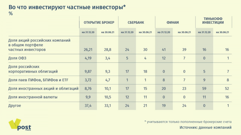 По данным ЦБ, на начало октября российские акции занимали почти 40%, иностранные — 13% от активов частных инвесторов на счетах в депозитариях. Розничные инвесторы стали главными покупателями российских акций, сообщал регулятор: с апреля по сентябрь 2021 г. доля населения в нетто-покупках российских акций превысила 85%.