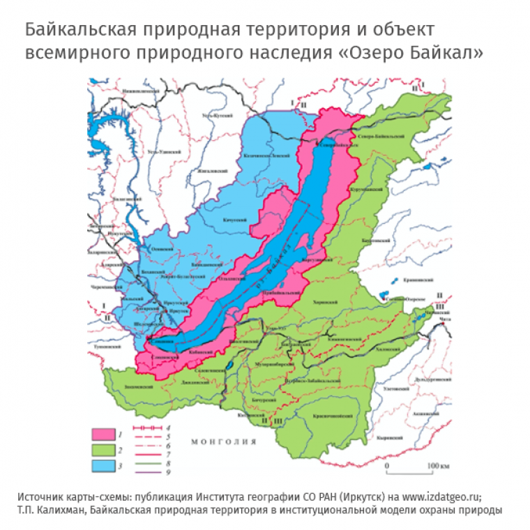 Экологические зоны Байкальской природной территории: 1 — центральная, совпадающая внешними границами с объектом всемирного природного наследия «Озеро Байкал», 2 — буферная, 3 — атмосферного влияния.