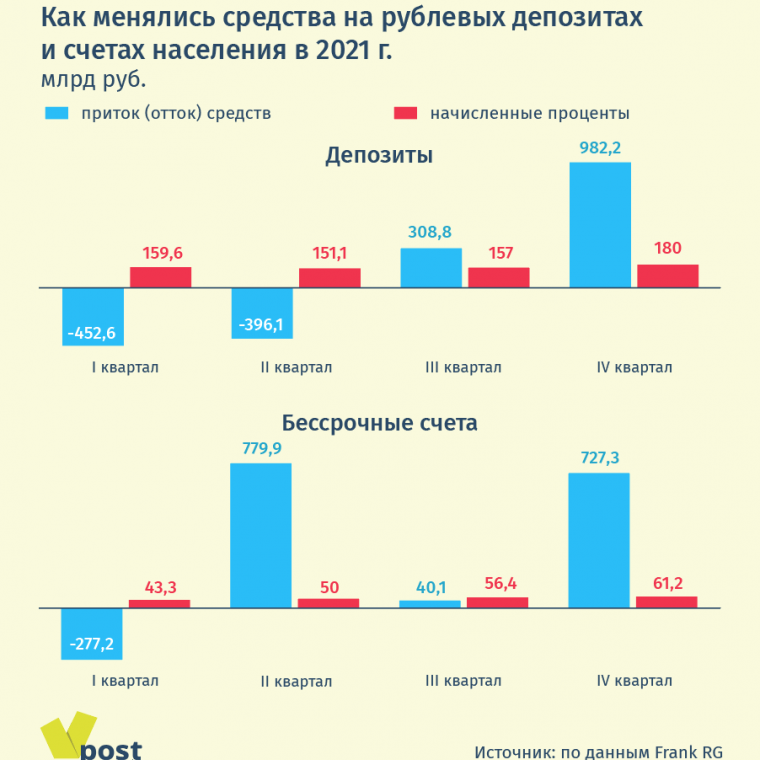 Их за 2021 год банки начислили на счета населения 905,4 млрд руб., подсчитали по просьбе VPost аналитики Frank RG. Средства населения при этом выросли на 1,81 трлн руб. — без учета счетов эскроу.