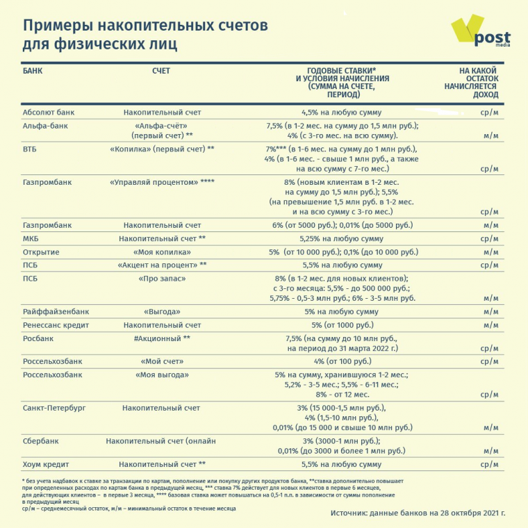 - Выбирайте счета с начислением процента на ежедневный (среднемесячный) остаток, если планируете пополнение и снятие средств. Они выгоднее.