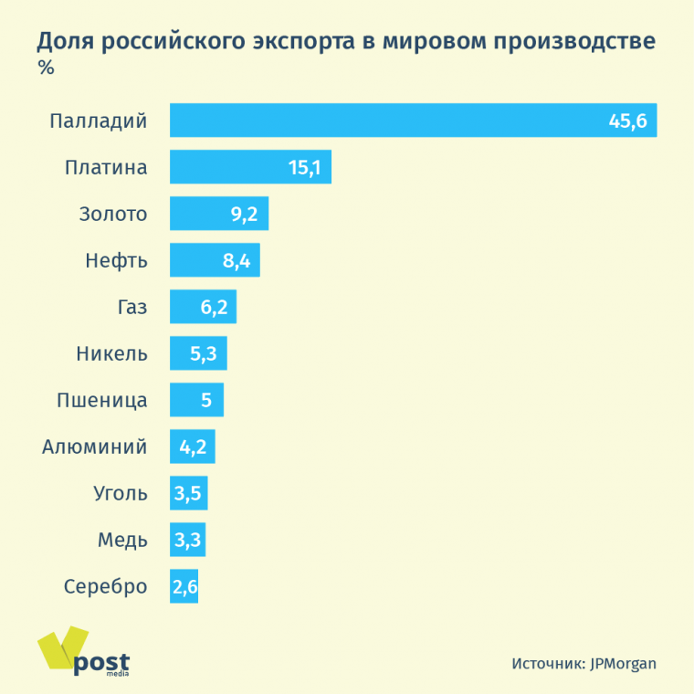 Россия — крупный экспортер многих видов сырья. Между тем, США и Евросоюз рассматривают возможность введения санкций против не только нефтегазовых, но и горнодобывающих компаний, написала Financial Times. В секторе металлов Россия является пусть и не доминирующим, но крупным игроком: по оценке JPMorgan, на нее приходится 4-6% мирового рынка переработанной меди, алюминия и никеля. Правда, аналитики Goldman Sachs напоминают, что американские санкции против UC Rusal в 2018 г. дестабилизировали рынок алюминия; по их мнению, политики вряд ли рискнут повторить эту историю.