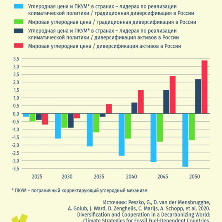 Усилия по диверсификации активов в долгосрочной перспективе ведут к увеличению благосостояния, поскольку экономика выигрывает от роста производительности вследствие инвестиций в исследования и разработки и в человеческий капитал, говорится в докладе ВБ и ВШЭ. По оценке его авторов, из-за лага между вложениями и результатом рост благосостояния в полной мере начнет реализовываться, начиная с 2035–2040 гг. Если диверсификация активов будет сочетаться с международным сотрудничеством в сфере климатической политики (включая введение углеродной цены), это даст прирост благосостояния на 3,4% в 2050 г. (по сравнению со сценарием без какой-либо диверсификации). Но даже без сотрудничества и при введении другими странами ПКУМ, диверсификация активов даст прибавку к благосостоянию в 2,2%.