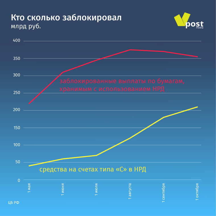 Но основные иностранные вложения приходятся на инвесторов из «недружественных» стран, а они крепко заморожены. ЦБ в обзоре раскрыл данные о средствах инвесторов, заблокированных в результате санкций и контрсанкций. Это выплаты по бумагам, хранимым с использованием НРД (их не получили российские инвесторы в иностранные бумаги) и средства на счетах типа «С» в НРД (туда зачисляются платежи по торгуемым в России бумагам, которыми владеют иностранные инвесторы).