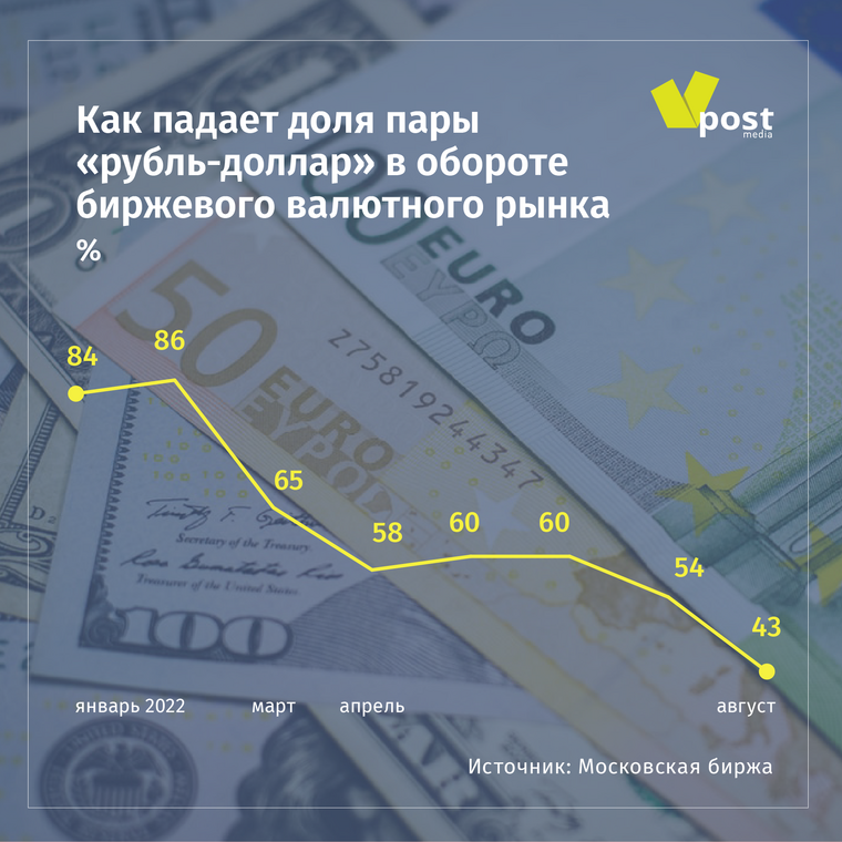 Это происходит на фоне значительного сокращения доли торгов парой «рубль-доллар» — она впервые опустилась ниже 50%. Пара «рубль-юань» стремительно догоняет «рубль-евро»: уже 19% (в январе был 0) против 23%.