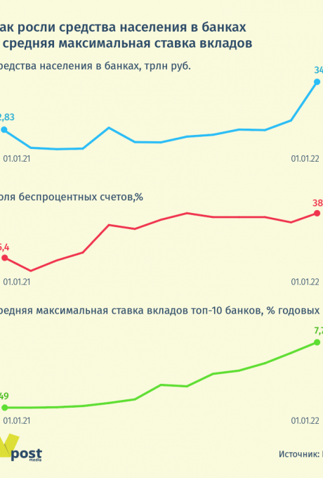Быстрый рост ставок в 2021 году (ключевая ставка увеличилась вдвое до 8,5%, средние ставки по вкладам в топ-10 банках выросли с 4,49 до 7,74%) в конце года заставил население нести деньги в банки.