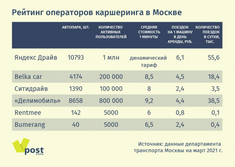 Каршеринг появился в России в 2012 г., но настоящий толчок отрасль получила через три года, когда Москва запустила проект «Московский каршеринг». Правительство Москвы предоставляет сервисам каршеринга и такси субсидии (300 млн руб. в 2020 г. и 280 млн руб. — в 2021 г.) и скидки на парковку. Например, стоимость парковочного места за 2020 г. для операторов каршеринга составила 26 700 руб.против 370 000 руб. для владельцев персональных автомобилей, говорится в проспекте «Делимобиля».