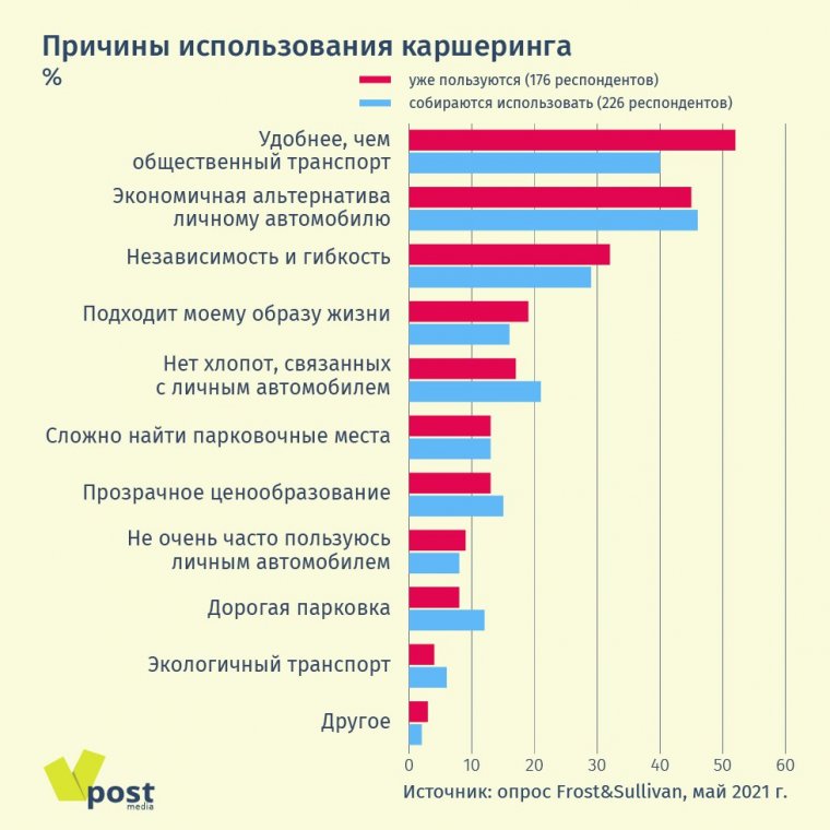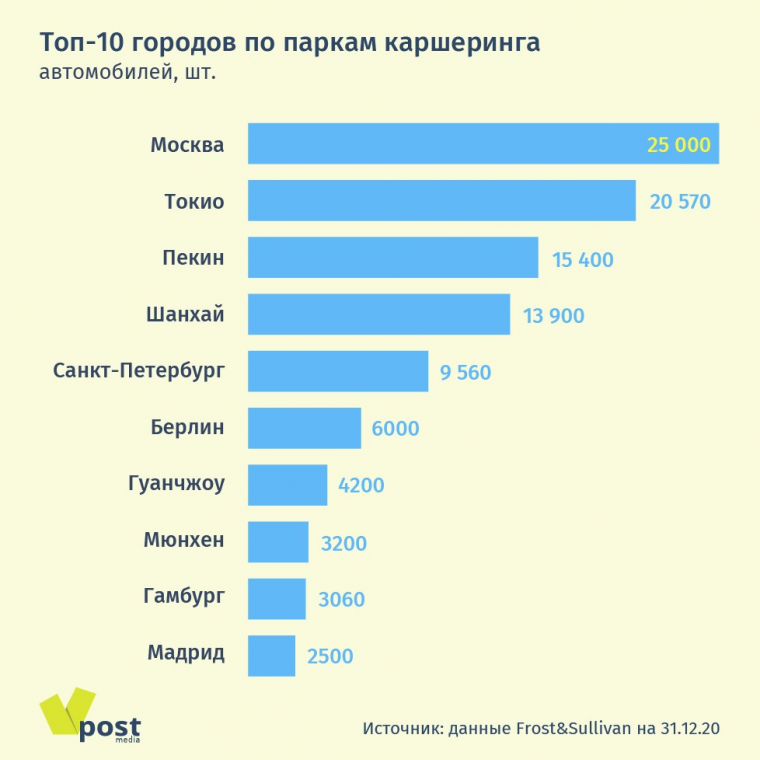 Больше всего каршеринговых машин, конечно, в Москве: по оценкам Frost & Sullivan, в 2020 г. их было 25 000 — больше всех в мире, а к 2025 г. он удвоится до более чем 49 000 авто. Будет расти и проникновение каршеринга: если в 2020 г. среди водителей от 18 до 60 лет каршерингом пользовались 22% в Москве и 5,3% в городах с населением более 500 000 человек, то к 2025 г., по прогнозам Frost & Sullivan, эти доли вырастут до 50% и 21% соответственно. Из всех способов перевозок каршеринг ближе всего к личному автомобилю, при этом пользователю не нужно дополнительно тратиться на топливо, страховку, обслуживание и ремонт автомобиля, указывает «Делимобиль» в проспекте эмиссии. По подсчетам Frost & Sullivan, в России при пробеге до 10 500 км ежегодно каршеринг будет выгоднее владения личным автомобилем.